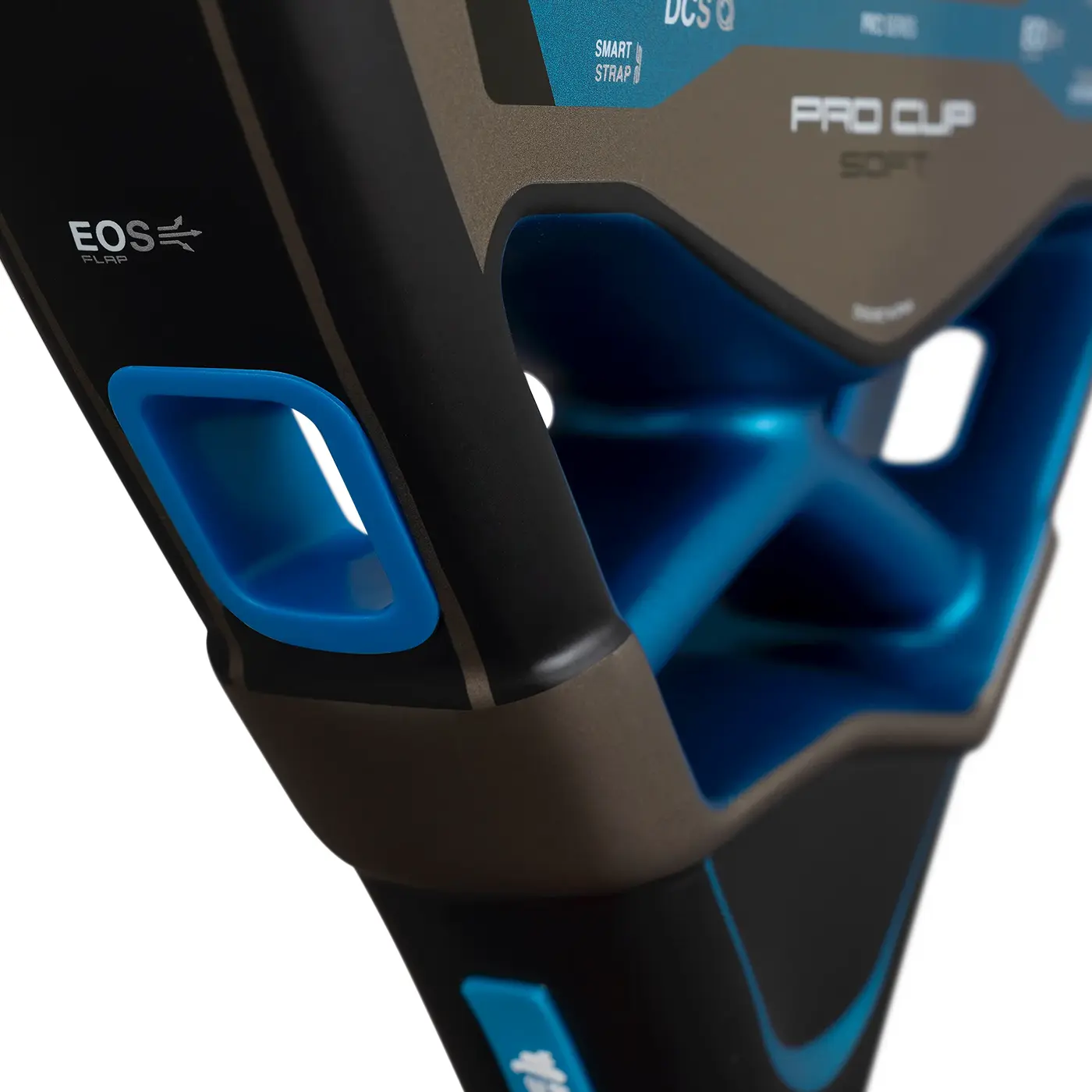 Among the most notable innovations of this racket are the Carbon Frame, which ensures solidity and consistency; the Pulse System, designed to reduce vibrations and improve comfort; and the EOS Flap, which provides greater aerodynamics and maneuverability with every movement. Finally, the SmartStrap® system allows for quick and easy replacement of the safety cord, guaranteeing hygiene, customization, and greater safety on the court.