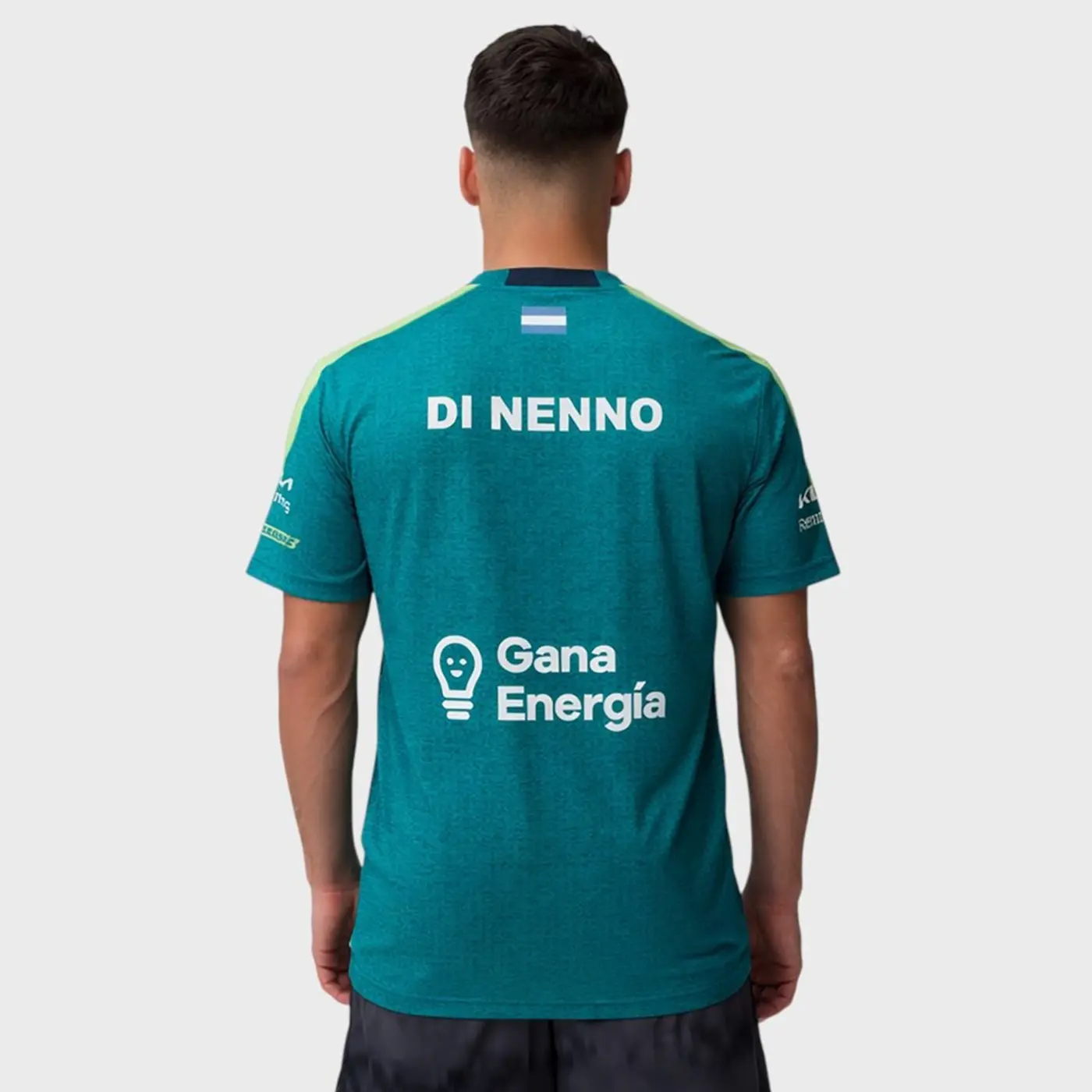This shirt features a clean athletic fit designed for mobility and performance. The front includes the main sponsor logo, while the back highlights the Di Nenno name with the Argentina flag. The green color provides a fresh and modern performance look.
