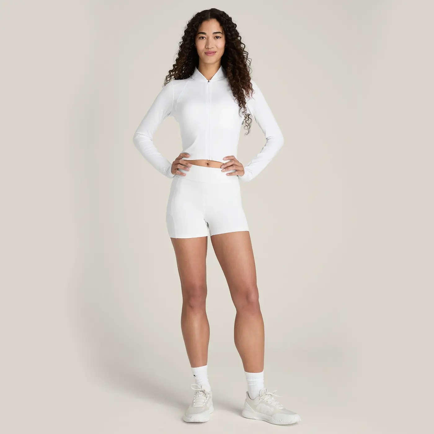 Su corte slim cropped, ligeramente más corto y ajustado, aporta un look deportivo actual, mientras que el cuello alto estructurado ofrece mayor cobertura. El cierre full zip facilita su uso como capa ligera antes, durante o después del partido.