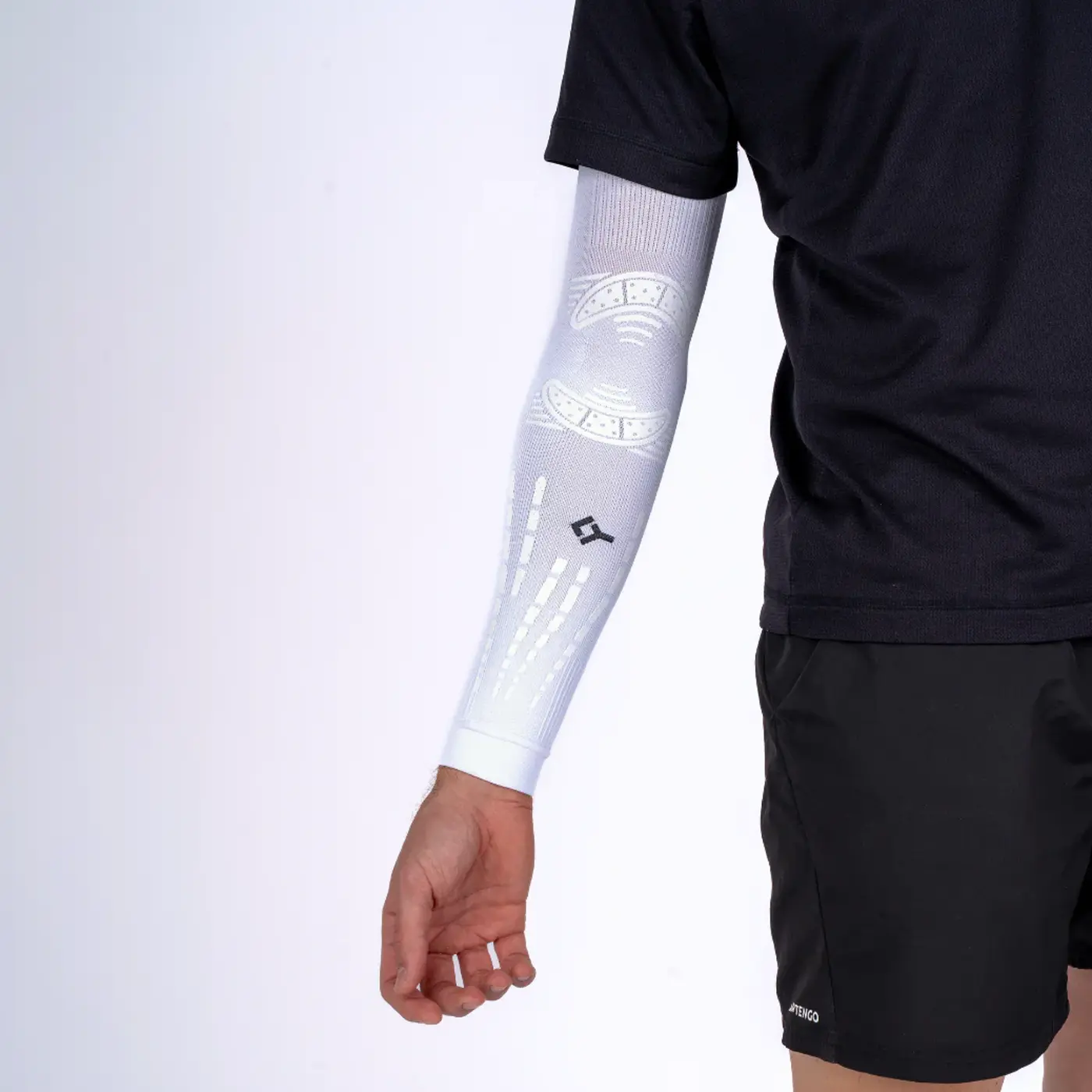 La manga está fabricada con una mezcla de alto rendimiento de poliéster, poliamida y elastano que aporta elasticidad y durabilidad. Las aplicaciones externas de silicona siguen la anatomía muscular del antebrazo para mejorar la absorción de vibraciones y la estabilidad. Su construcción transpirable garantiza comodidad durante el uso prolongado.